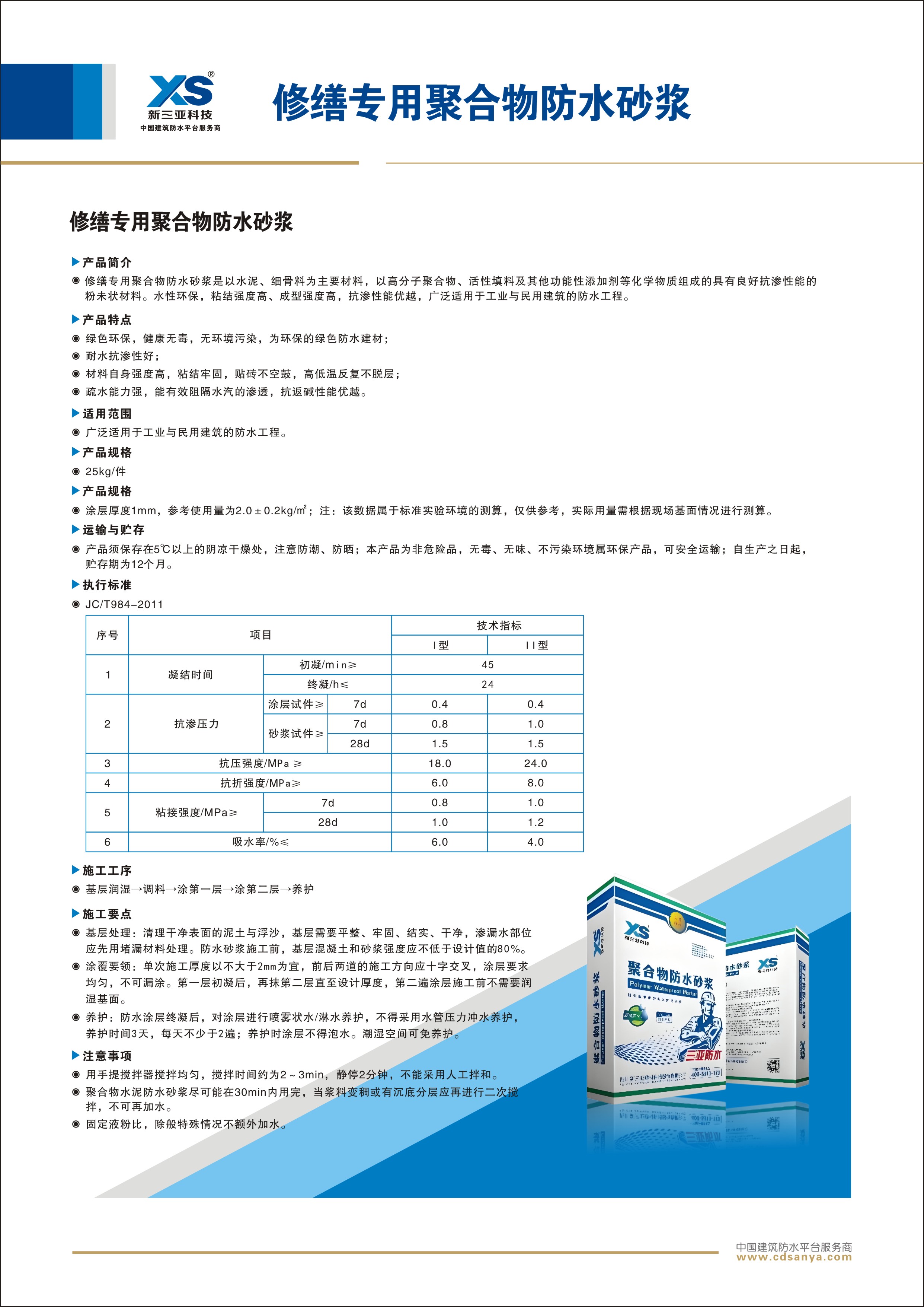聚合物水泥防水砂漿是是以水泥、細骨料為主要材料,以高分子聚合物、活性填料及其他功能性添加劑等化學物質組成的具有良好抗滲性能的粉未狀材料。水性環保,粘接強度高、成型強度高,抗滲性能優越,廣泛適用于工業與民用建筑的防水工程。
