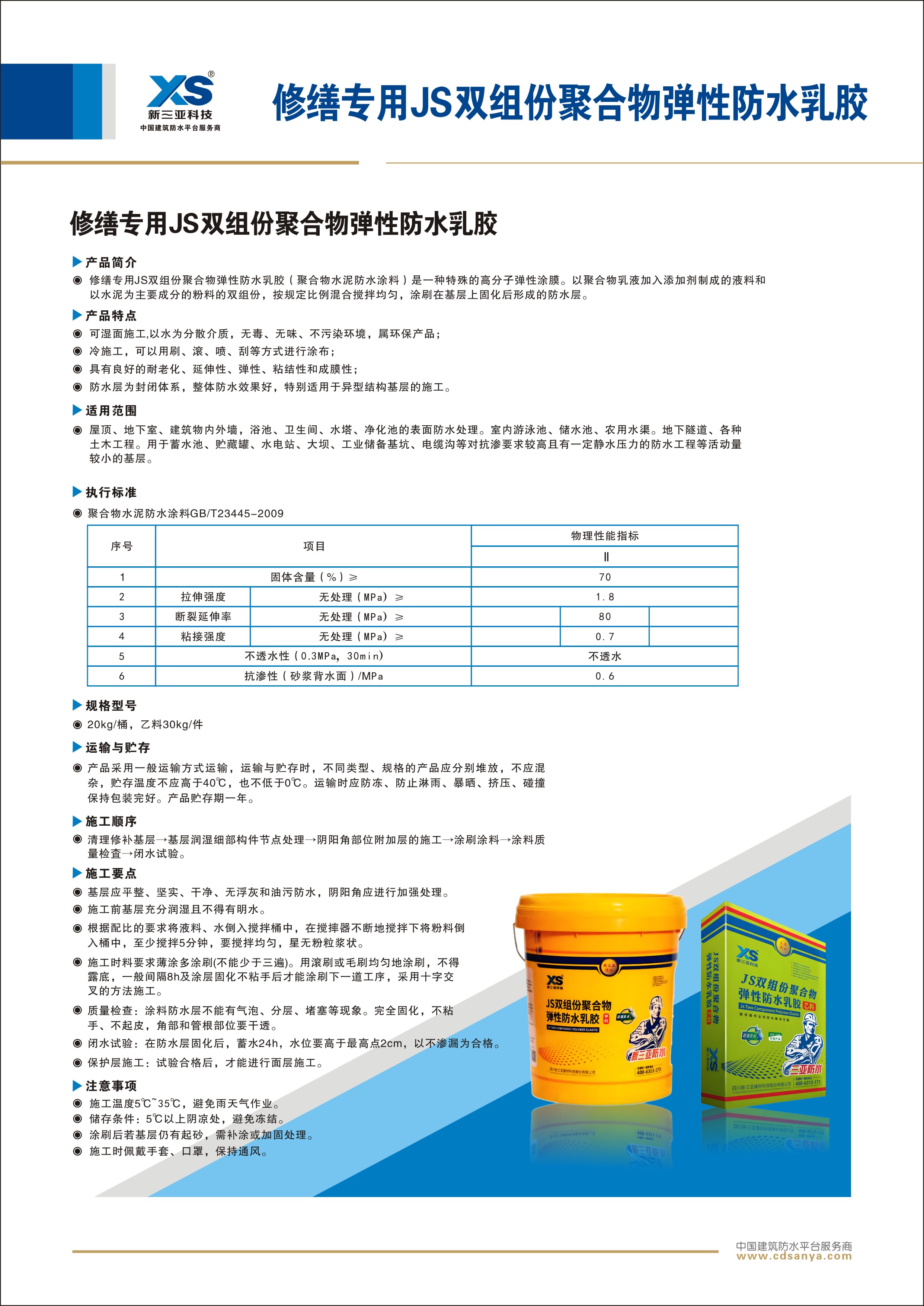 產品簡介: 修繕專用JS雙組份聚合物彈性防水乳膠是一種特殊的高分子彈性涂膜。以聚合物乳液加入添加劑制成的液料和以水泥為主要成分的粉料的雙組份,按規定比例混合攪拌均勻,涂刷在基層上固化后形成的防水層。該產品由甲、乙組份組成。 規格:J甲料20kg/桶,乙料30kg/件 | ![]() |
